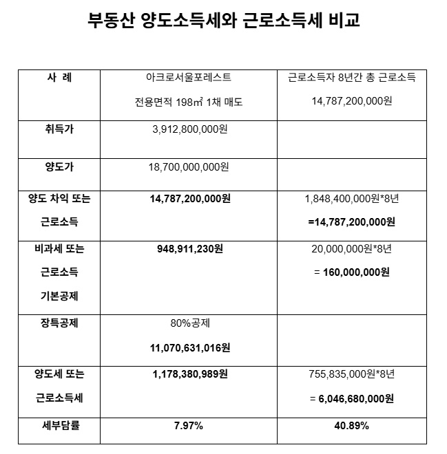 22일 <아사진미디어>가 현장 전문가 장석호 공인중개사의 도움을 받아 초고가 아파트 '아크로서울포레스트'에 대한 양도소득세와 근로소득자의 근로소득세를 분석한 결과, 이같이 확인됐습니다.