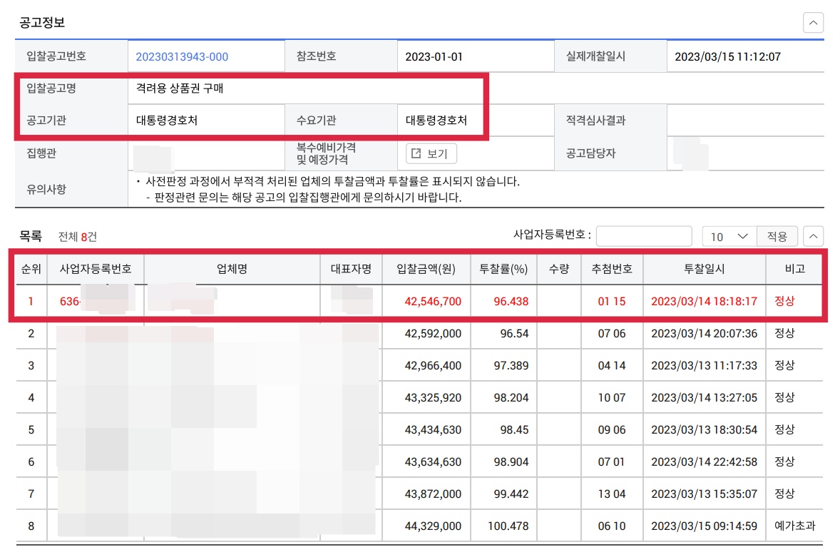 특정 업체를 정한 뒤 계약하는 '수의계약' 형태로 공고를 냈지만, 입찰은 진행됐다. 이에 8개 업체가 응찰했고, 최저가를 제시한 A사가 계약을 따냈다. 2023년 3월 24일 A사는 대통령경호처와 4254만원 규모의 상품권 판매 계약을 체결했다.