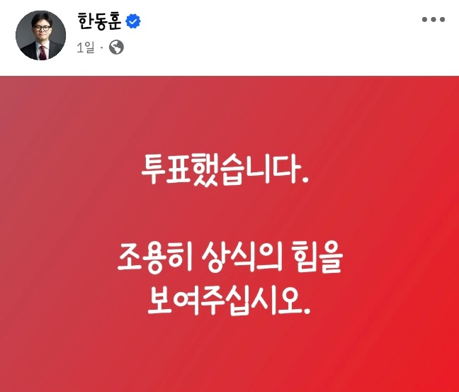 한동훈 전 대표는 지난 20일 오전 페이스북에 "투표했다. 조용히 상식의 힘을 보여달라"고 짧은 글을 남겼습니다. 이어 같은 날 오후 '친한동훈계' 한지아 국민의힘 의원이 페이스북에 자신과 조경태 후보가 함께 찍은 사진을 올리면서 "상식의 힘"이라고 적었는데요.